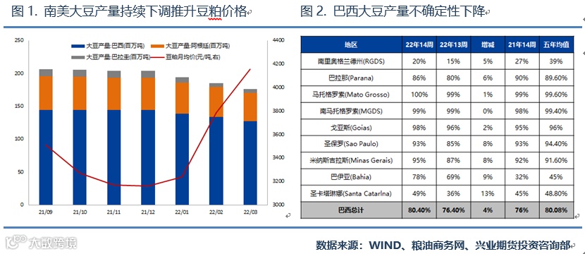 本轮豆粕持续上涨的主要驱动之一来源于南美大豆产量被持续下调,受到厄尔尼诺天气因素的影响,USDA自2021年10月起便下调了阿根廷大豆产量,但由于南美大豆出口约70%来源于巴西,因此直到2022年1月巴西产量遭到下调后,豆粕价格才开始出现快速上涨。经过累计6次的调整,南美大豆产量共下调3070万吨,后续南美大豆进一步下调的空间可能相对有限,其主要原因有:1.近期巴西和阿根廷干旱地区的降雨情况有所改善,产量存在边际好转的预期;2.目前南美主产区巴西大豆的收获已经基本完成,截止2022年4月1日,巴西大豆主产州收获进度已经达到了80.4%,产量进一步下调的空间有限,不确定性正在快速下降。此外豆粕价格对于大豆减产已经在过去的三个月内有了较为充分的,南美产量对于价格的支撑正在边际减弱。