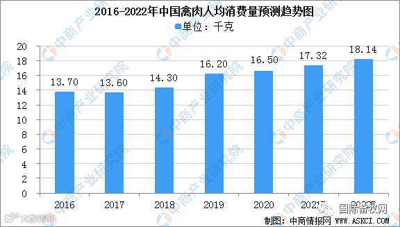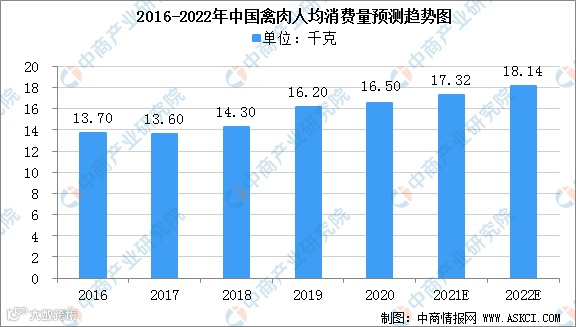 据国家统计局统计数据显示,近年来,我国居民人均禽肉消费量呈现平稳增长态势。2017-2019年中国禽肉人均需求量逐年增加,2018年中国禽肉人均需求量为14.3千克,同比增长4.95%;2019年中国禽肉人均需求量为16.2千克,同比增长13.41%。预计2022年中国禽肉人均消费量将达18.14千克。
