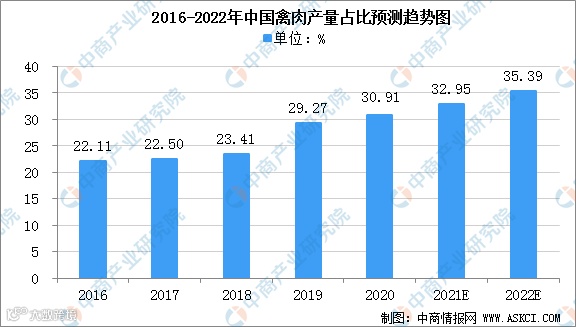 近年来,禽肉产量占肉类总产量比例呈现逐年上升的态势,由2016年的22.11%上升到2020年的30.91%。随着白羽鸡养殖技术不断成熟及速冻食品的普及,预计2022年中国禽肉产量占肉类的占比将提升至35.39%。