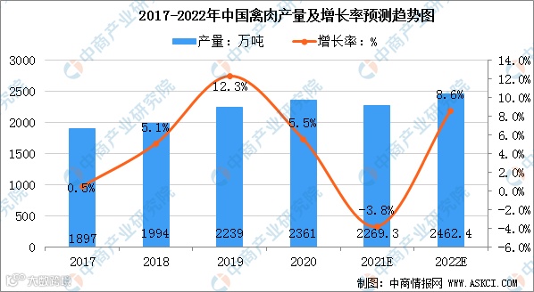 2017-2019年中国禽肉产量持续增长,2018年中国禽肉产量为1994万吨,同比增长5.1%;2019年中国禽肉产量为2239万吨,同比增长12.3%。中商产业研究院预计2022年中国禽肉产量将达2462.4万吨。