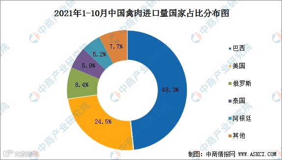 2021年1-10月累计,禽肉进口120.54万吨,同比减3.8%,进口额27.85亿美元,同比减3.4%;出口18.55万吨,同比增15.5%,出口额5.31亿美元,同比增21.0%。进口主要来自巴西(占进口总量48.3%)、美国(24.5%)、俄罗斯(8.4%),泰国(5.9%)、阿根廷(5.2%),从美国进口量环比减11.4%,进口占比环比减4.7个百分点。分产品看,冻鸡爪、带骨冻鸡块和冻鸡翼进口量占比分别为45.0%、22.8%和22.6%。主要出口到我国香港、澳门地区和巴林、柬埔寨、蒙古等国。