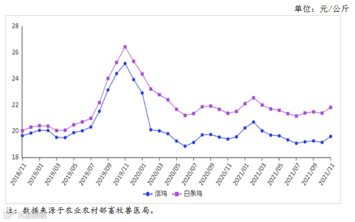 种禽产能压减,消费增加,禽肉价格上涨。2021年11月份,活鸡集市均价每公斤19.60元,环比涨2.3%,同比涨1.0%;白条鸡集市均价每公斤21.82元,环比涨2.1%,同比涨2.1%。