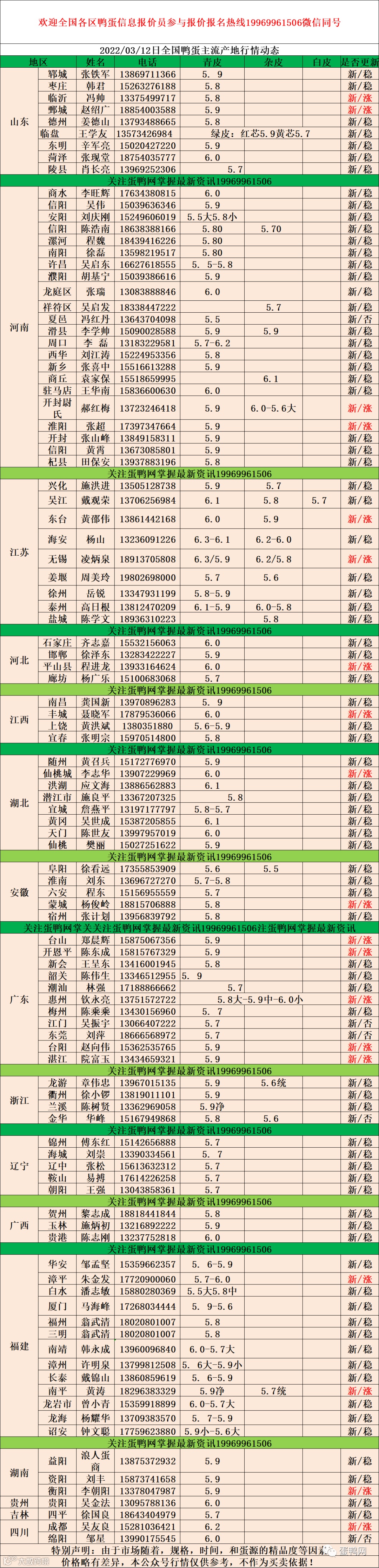 2022年03月12日鲜鸭蛋价格:初产至10个头5.3元 。 10个头至9个5.5元。9个头至大蛋5.7元(鸭蛋价格仅供参考)。