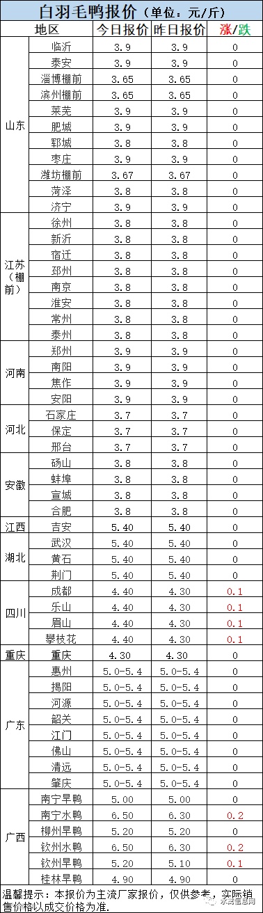 今晚北方毛鸭报价持稳,随着成本增长,冷藏养殖端压力倍增,毛鸭受成本支持整体呈偏强趋势。