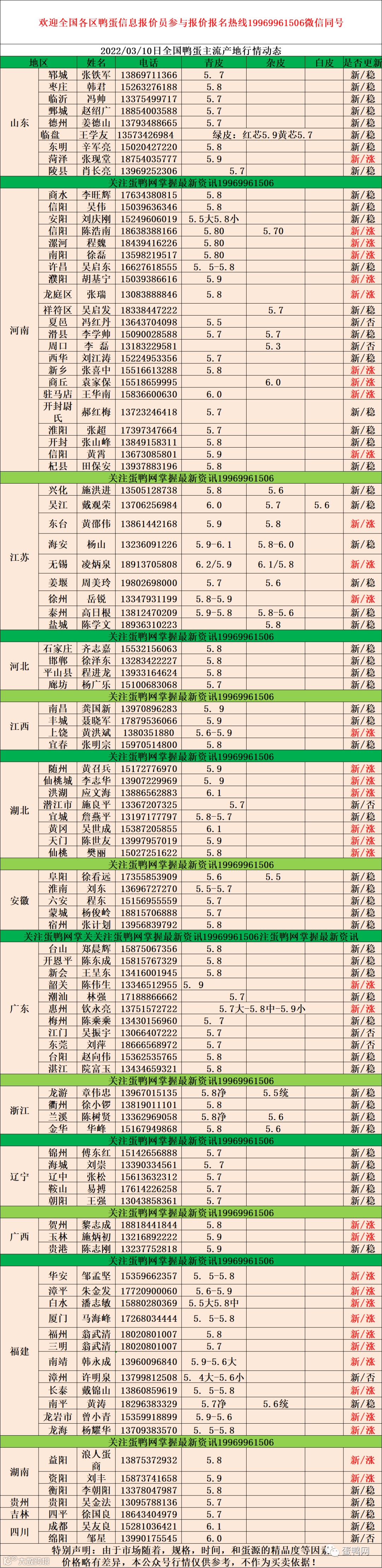 2022年03月10日鲜鸭蛋价格:初产至10个头5.3元 。 10个头至9个5.5元。9个头至大蛋5.7元(鸭蛋价格仅供参考)。