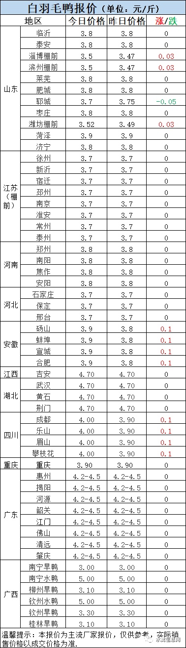 饲料连续上涨,养殖成本上涨,冷藏合同下调,供需两端博弈加剧,今日鸭苗报价继续下滑。