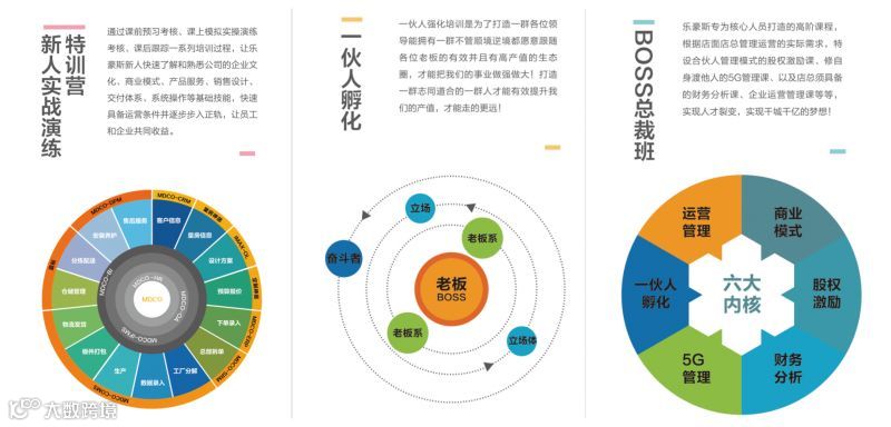 目前,整装商学院经过5年的打造,依据乐豪斯合作伙伴需求,针对各个岗位、合作伙伴不同发展阶段、乐豪斯家人不同职业发展阶段等角度,量身定制了“新人实战演练特训营”、“一伙人打造”、“BOSS总裁班”等系列课程。秉承“学为战、不为看”的培训理念,助力每一位乐豪斯人快速了解和熟悉公司的企业文化、商业模式、产品服务、销售设计、交付体系、系统操作等,提升店面运营效能,共创业绩奇迹,共享万亿市场。