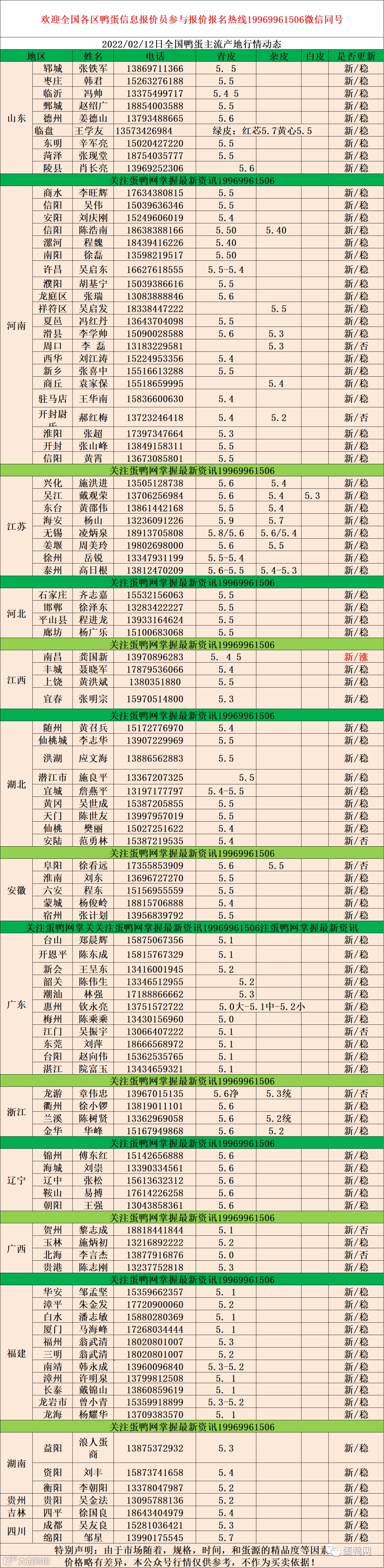 2022年02月12日鲜鸭蛋价格:初产至10个头5.0元 。 10个头至9个5.2元。9个至7个半5.4元。7个半至7个头5.5元,足7个头5.6元(鸭蛋价格仅供参考)。