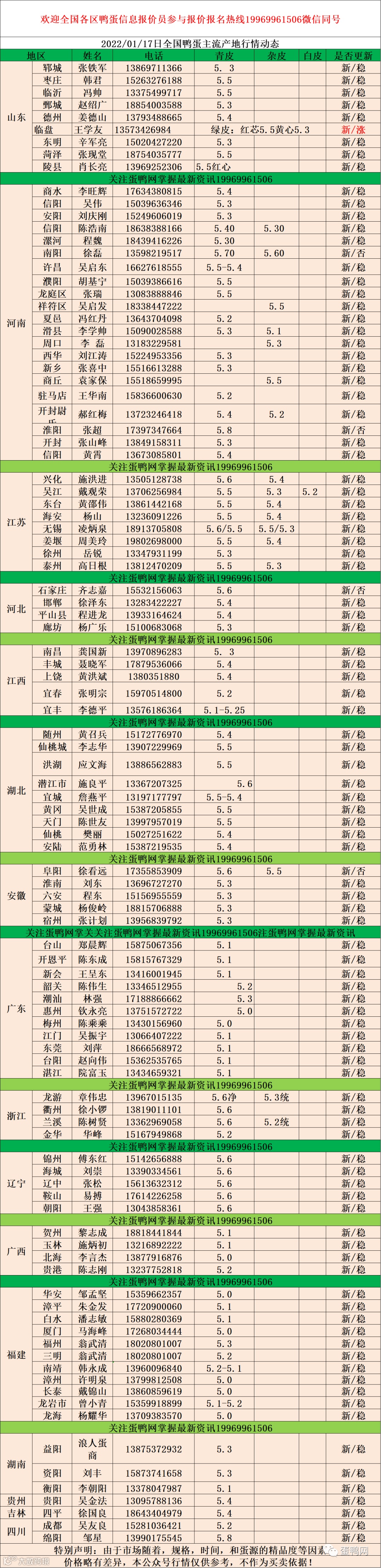 2022年01月17日鲜鸭蛋价格:初产至10个头5.0元 。 10个头至9个5.2元。9个至7个半5.4元。7个半至7个头5.5元,足7个头5.6元(鸭蛋价格仅供参考)。