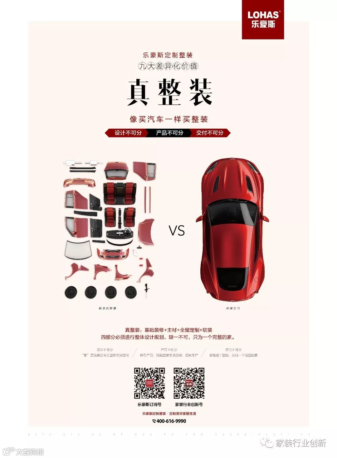 像买汽车一样买整装,整装与整车研发有着并行不悖的道理。7年整装路,乐豪斯逐渐捋出三个真正的整装标准:设计不可分、产品不可分、交付不可分。所谓设计不可分,即“家”是完美组合的整体生活空间,乐豪斯设计大师将整体空间拆分成五部分,基础装修+主材+全屋定制+软装+灯光。五大领域设计专家进行细分设计,每一部分都要精心打造;产品不可分——所有产品,根据整体生活空间,定制生产。不是材料的简单拼凑堆砌,产品元素相互关联不可分离,更不必为挑选单一产品元素而陷入选择困难;交付不可分——乐豪斯全程施工管控。从基础装修、主材、全屋定制到软装,全部由乐豪斯统一施工、安装到交付。环环相扣,完美衔接下一步工序,完美交付一个新家。