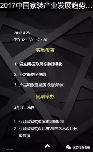 论坛期间,还将举办互联网家装渠道和采购招商、互联网家装设计与VR的艺术设计升级展演、产品和服务展演与对接洽谈同步,后期还将安排家装及互联网项目考察等丰富多彩的活动。