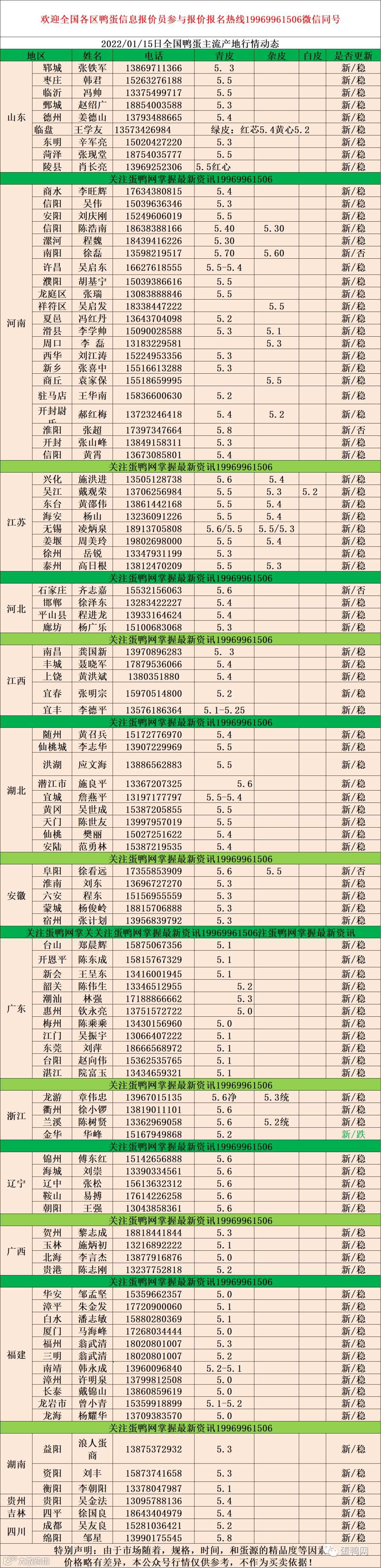 2022年01月15日鲜鸭蛋价格:初产至10个头5.0元 。 10个头至9个5.2元。9个至7个半5.4元。7个半至7个头5.5元,足7个头5.6元(鸭蛋价格仅供参考)。