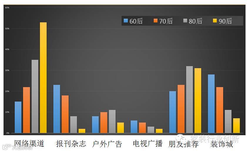从了解装修信息的渠道看,50%以上的90后通过网络来了解装修;平面媒体渠道占有率下降的很厉害,60后还在看,90后基本没有关注;户外广告对整个90后的影响也极小;从广播电视上选家装机会也很小;大量80后、90后通过朋友和网络了解家装信息;90后崇尚方便,逛装饰材料市场也是他们最不愿意选择的渠道。