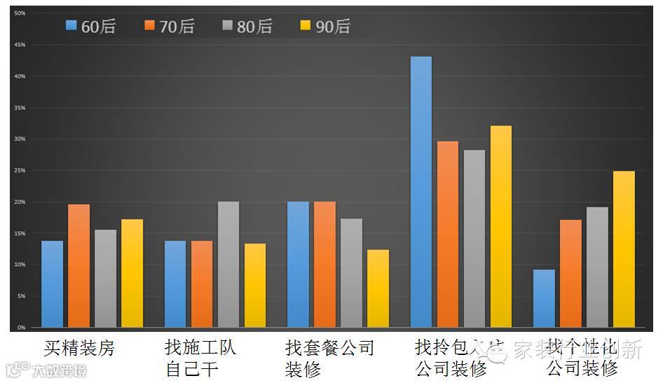 从装修模式的选择看,90后更愿意买精装房;而找施工队装修的意愿比80后低约13%;90后找套餐公司装修的比例也不高;反而是找拎包入住装修的群体60后和90后最多。60后年龄较大,以前装修房子的痛苦加上体力跟不上,更愿意找拎包入住;90后对个性化要求较高,但不愿意自己去买装修更具享乐主义,所以拎包入住装修比例很高。