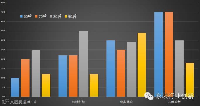 从如何选择装修公司看,品牌广告对90后的影响力不如对80后大;由于90后在互联网经历各种促销,对促销敏感度也在降低。90后最重整体的服务和体验,更注重参与感。品牌不再重要,单品品牌、建材品牌对90后群体做出装修选择的影响力已经明显减弱。