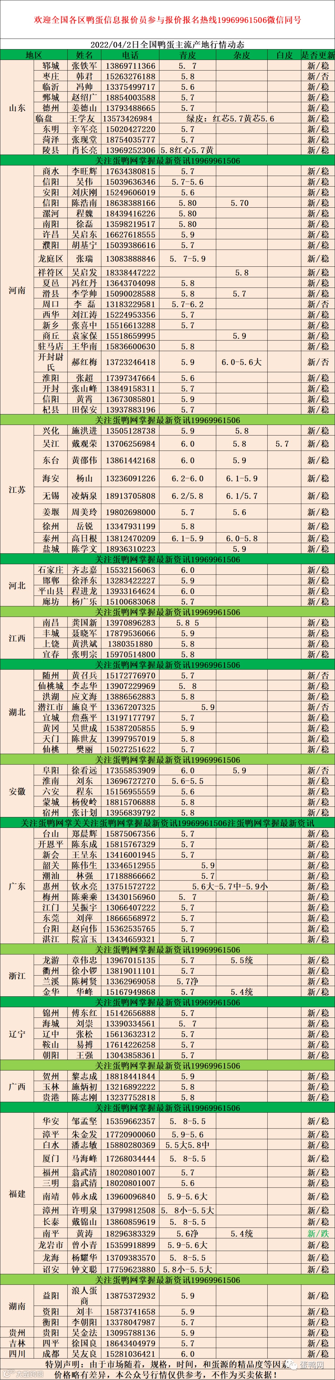2022年04月2日鲜鸭蛋价格:初产至10个头5.3元 。 10个头至9个5.5元。9个头至大蛋5.7元(鸭蛋价格仅供参考)。