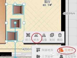 **多选对齐操作:**可对被多选选中的家具可进行对齐操作,包括:左对齐、右对齐、顶部对齐、底部对齐,在多选操作弹窗中点击“对齐”,然后选择相应的操作即可