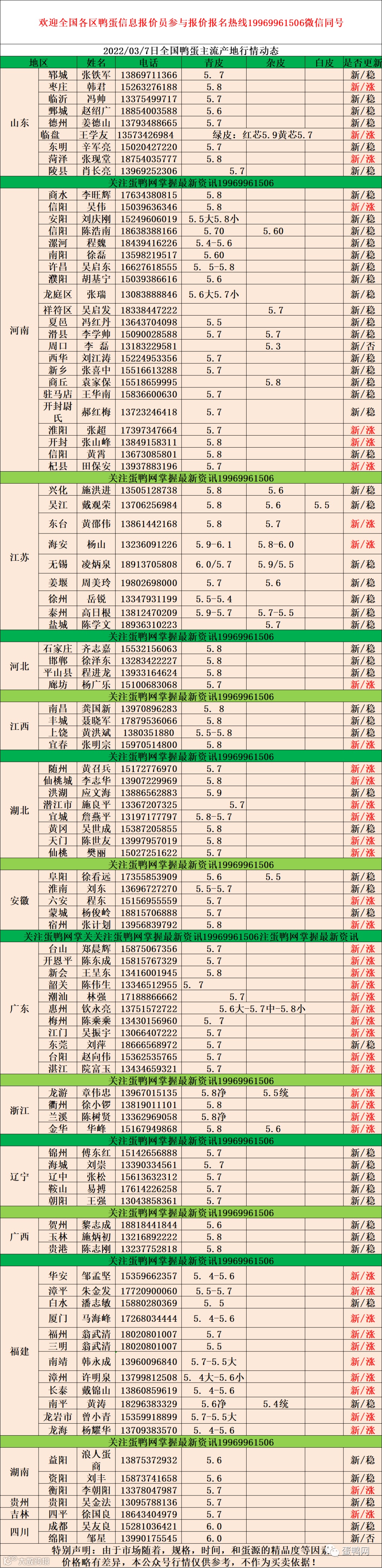 2022年03月7日鲜鸭蛋价格:初产至10个头5.3元 。 10个头至9个5.5元。9个头至大蛋5.7元(鸭蛋价格仅供参考)。