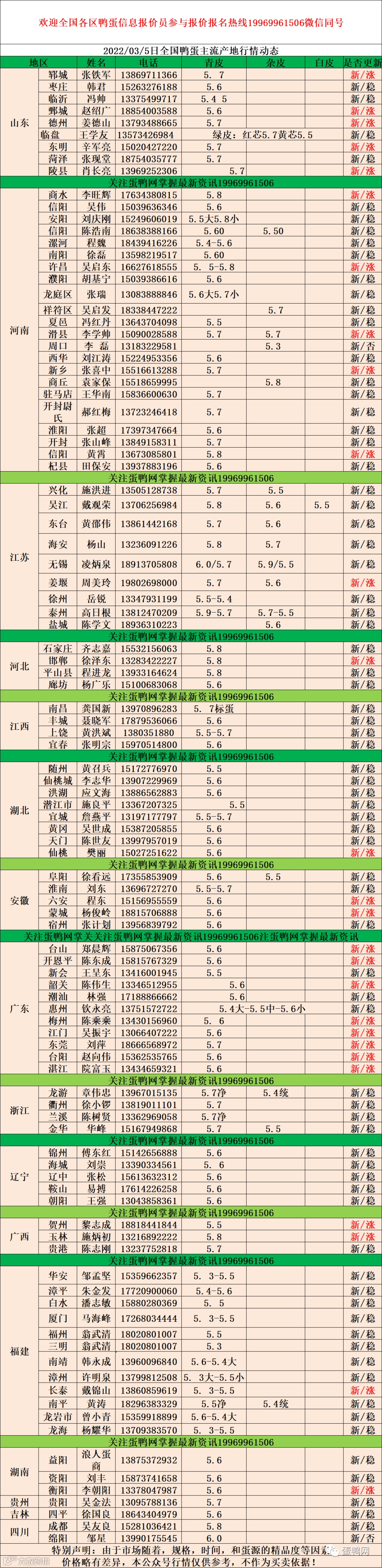 2022年03月5日鲜鸭蛋价格:初产至10个头5.2元 。 10个头至9个5.4元。9个头至大蛋5.6元(鸭蛋价格仅供参考)。