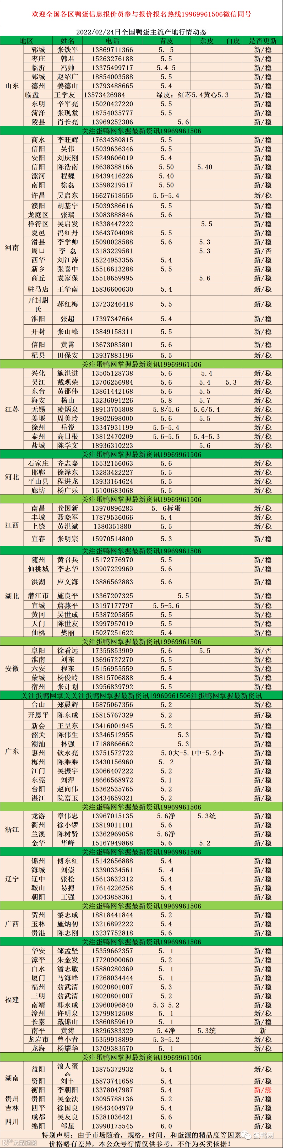 2022年02月24日鲜鸭蛋价格:初产至10个头5.0元 。 10个头至9个5.2元。9个头至大蛋5.4元(鸭蛋价格仅供参考)。