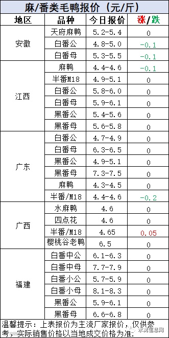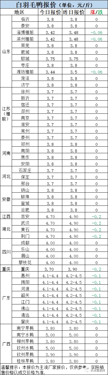 今晚北方毛鸭报价弱势调整,波动下滑。主要是产品不给力,对毛鸭支持较差。当前饲料成本连续上涨,疾病严重,养殖利润被严重压缩,无奈消费较差。