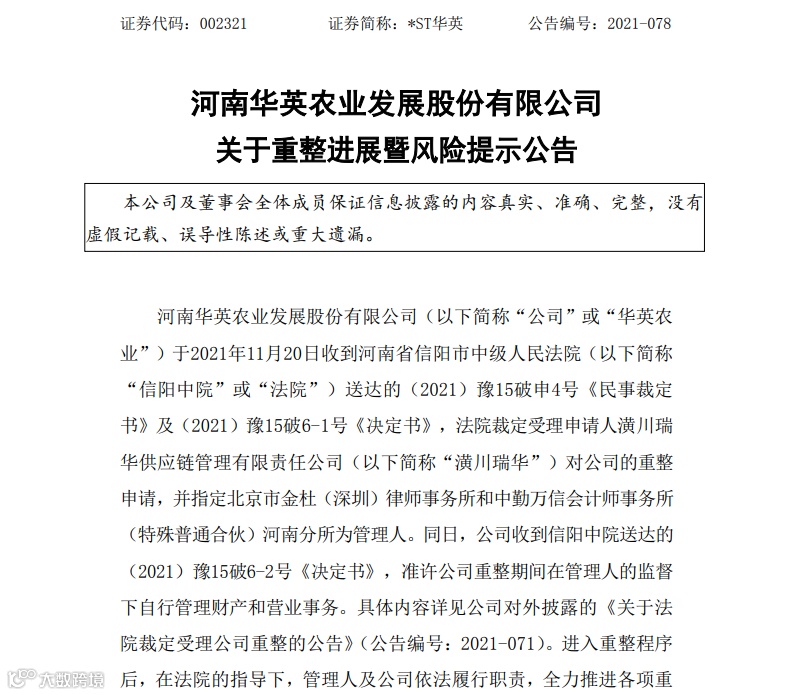 2、华英农业重整案第一次债权人会议将于12月22 日上午10时采取线上线下同时召开。