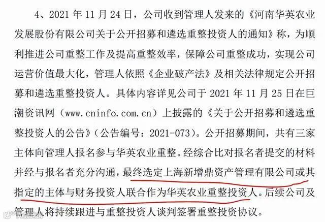 3、公开招募期间,共有三家主体向管理人报名参与华英农业重整。公告显示,经综合比对报名者提交的材料并经与报名者充分沟通,最终选定上海新增鼎资产管理有限公司(以下简称“新增鼎”)或其指定的主体与财务投资人联合作为华英农业重整投资人。