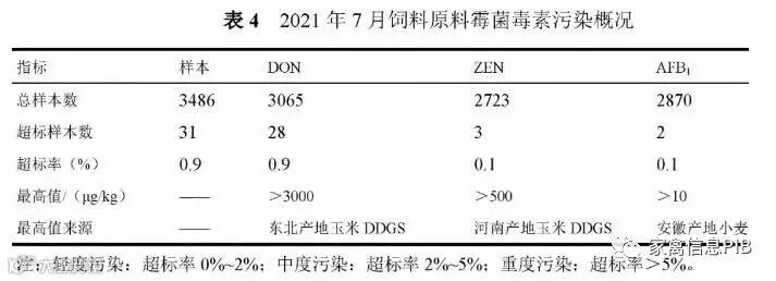近4个月饲料原料霉菌毒素多为中、轻度污染,DDGS和小麦次粉7月霉菌毒素超标率分别为2.4%和3.2%,达中度污染,呈增加趋势,需重点关注。