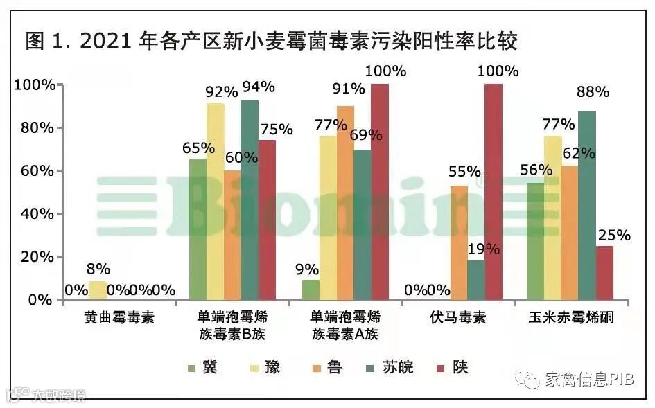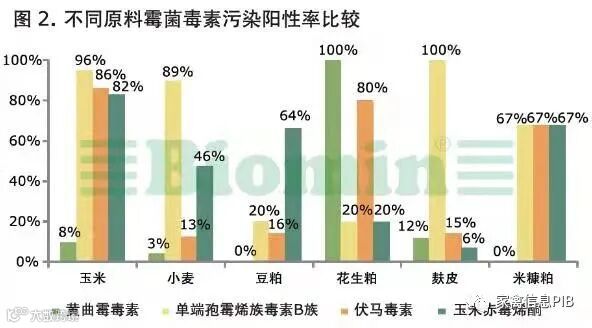 (3)小麦次粉:安徽产地呕吐毒素重度污染,河南产地呕吐毒素、黄曲霉毒素B1中度污染,河北、江苏、山东及陕西产地霉菌毒素污染较轻。