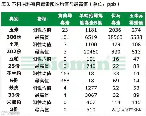 (1)黄曲霉毒素污染,花生粕延续往年的高毒素污染,玉米的阳性率不高,但是阳性均值需要关注。