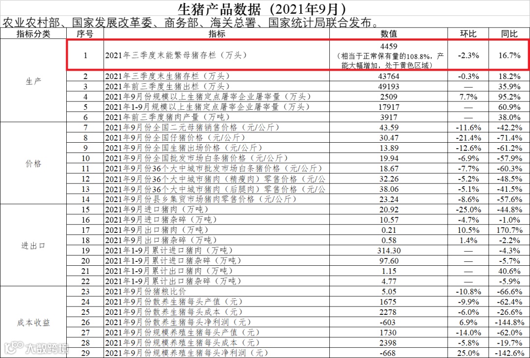 由农业农村部、国家发展改革委、商务部、海关总署、国家统计局联合发布的生猪产品数据(2021年9月)中,今年三季度末能繁母猪存栏为4459万头,并注明了“相当于正常保有量的108.8%,产能大幅增加,处于黄色区域”,这是农业农村部在9月23日印发《生猪产能调控实施方案(暂行)》后,首次在发布能繁母猪存栏数据时加注说明。