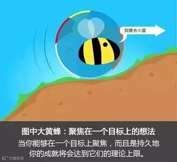 我们不妨换个思维:你把自己变成一只巨大的大黄蜂,向一个方向猛推。也就是在一个目标上聚焦,而且是持久地,你的成就将会达到它们的理论上限。你绝对会扔掉所有其它的事情。而且你会行动得非常迅速。专注,这可能是能够成功的唯一策略。