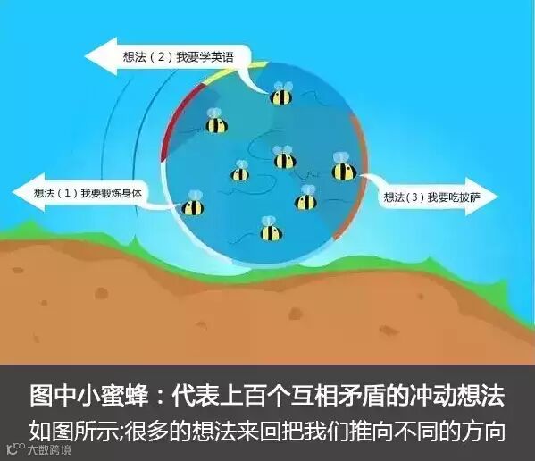 如图所示,如果把大脑比作“灌满了蜜蜂的沙滩排球”,图中小蜜蜂很多的想法来回把我们推向不同的方向。