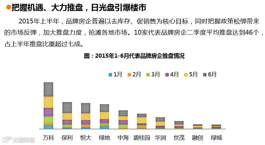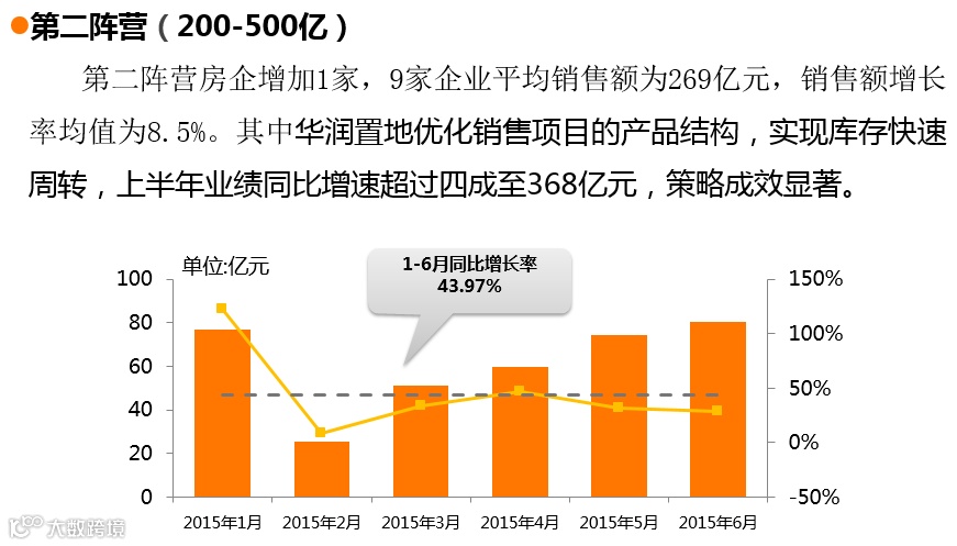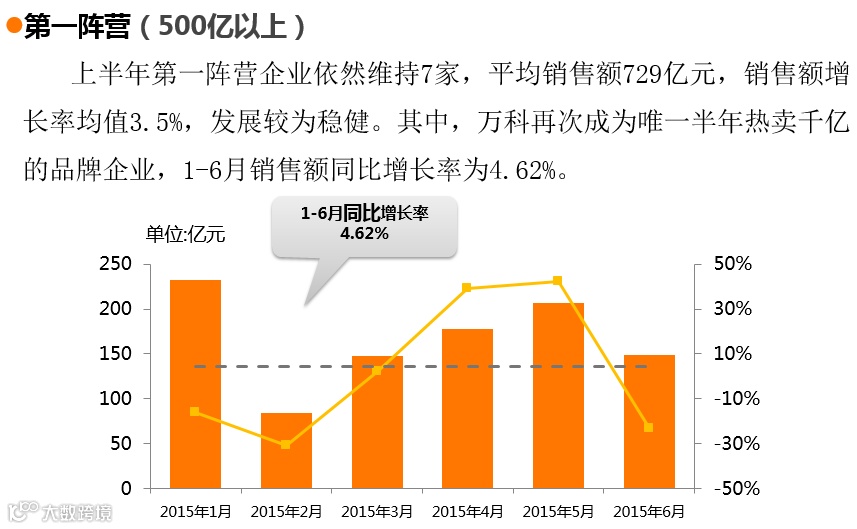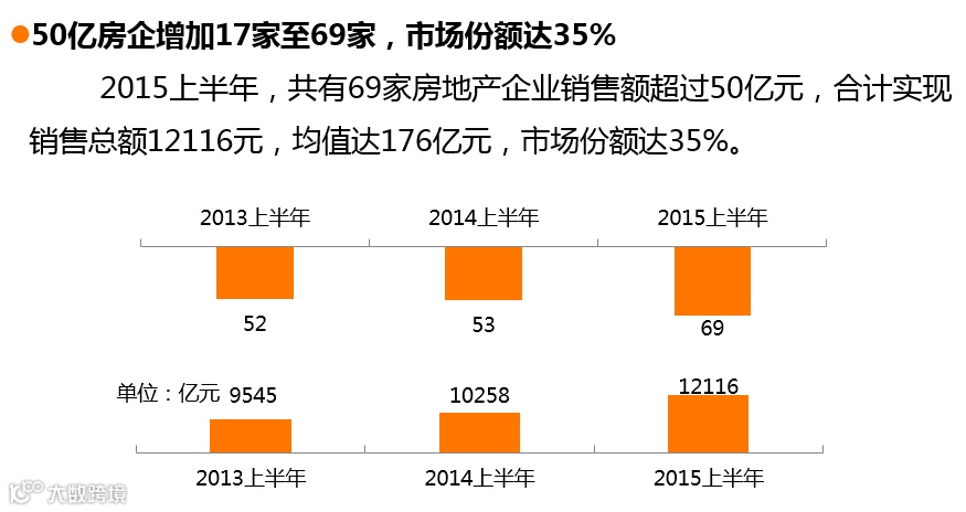 根据中指院的监测,截至6月30日,销售额超过50亿的企业达到69家,比去年同期增加了16家,销售额共计12116亿元,约占全国市场份额的35%。万科再次率先跨越千亿,恒大、绿地、保利、中海、碧桂园和万达也超过500亿,整体表现出强者恒强的发展态势。