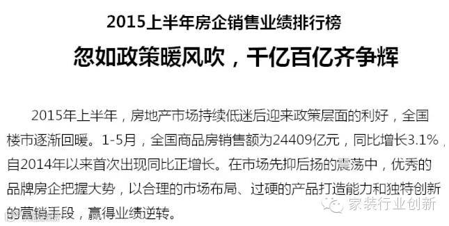 乐装天下整装平台中国指数研究院近日发布了《2015上半年品牌房企销售业绩排行榜》。报告称今年上半年全国楼市逐渐回暖,1-5月,全国商品房销售额为24409亿元,同比增长3.1%,自2014年以来首次出现同比正增长。