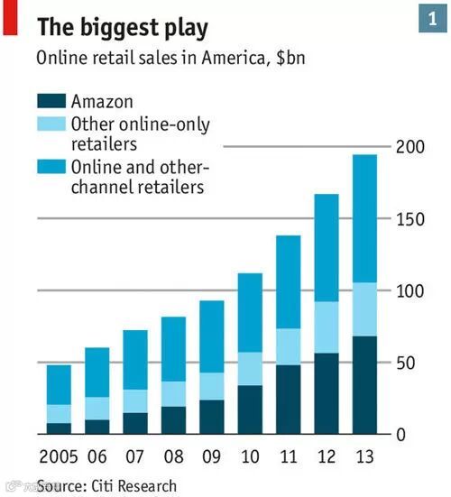 根据零售媒体InternetRetailer公布的数据显示,亚马逊在美国市场的在售商品种类多达23万种,是沃尔玛在售商品种类的约30倍。作为全球最大的零售商,沃尔玛也拥有增速迅猛的在线业务。去年,亚马逊的全部年营收为745亿美元。不过,如果将其他厂商通过亚马逊第三方交易平台Marketplace销售的产品计算在内的话,亚马逊的年营收还将接近翻一番。尽管已经成为全美最大的在线零售商,但亚马逊的年营收增速仍然高于电子商务市场17%的平均水平。而在欧洲和日本市场,亚马逊也同样是顶级在线零售商,并开始布局中国市场。按照去年的年营收计算,亚马逊是全球第九大零售商。而根据市场研究机构Kantar Retail的预计,截至2018年,亚马逊将成为全球第二大零售商。