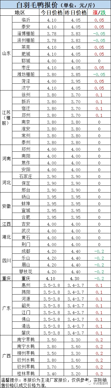1:今晚北方毛鸭报价涨跌调整,主体稳中趋强,山东进厂及苏北今晚均有上涨。