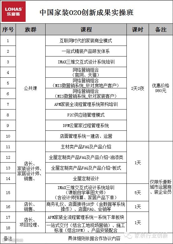 课程全部为实战课程,涉及:中国家装O2O创新成果的建店系统&店面管理培训、网上平台联合营销系统培训、四大软件系统培训、产品与服务等供应链管理培训,涉及家装销售族群.设计族群.工程族群.供应商族群,涵盖家装公司各工种各岗位,培训完成后成绩合格者颁发中国家装O2O创新成果实操培训相关资质证书。一场完美的家装镀金培训盛宴即将开幕,各位家装精英们还在等什么?