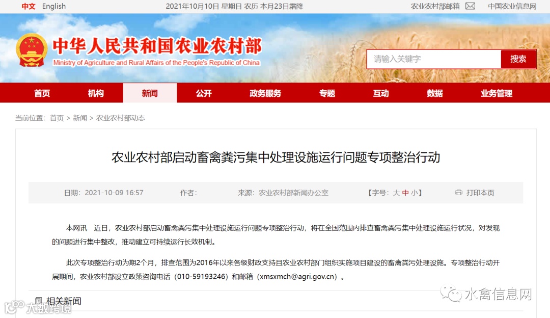 导读:农业农村部网站10月9日消息,近日,农业农村部启动畜禽粪污集中处理设施运行问题专项整治行动,将在全国范围内排