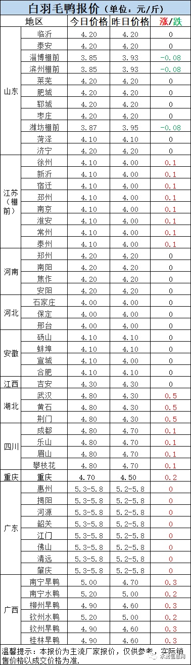 1:今晚北方毛鸭报价涨跌不一,近日温度再次上升,山东棚前略有下滑,周边区域进场价稳中走强。天热放养量下降,回收率降低,冻品渐次走强,拉动毛鸭价格上涨。疾病严重,饲料高位,导致合同鸭回收成本持续高位,产品低位运行,冷藏日子依然艰难。