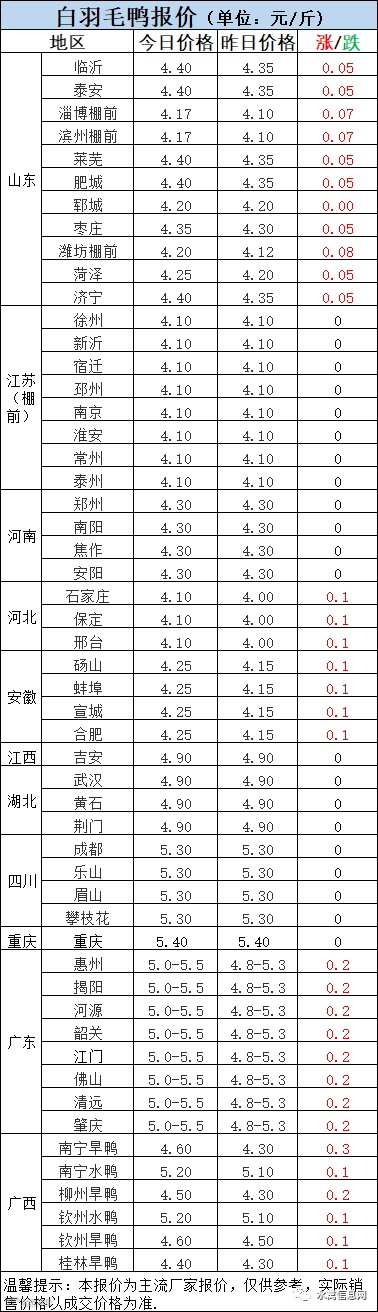 1:今晚北方毛鸭报价整体走强。风雨过后冷藏开始加紧收货,毛鸭价格上涨,主要还是得益于近期鸭产品的持续走强,以及天气炎热放养量及回收率都不多,冷藏库存普遍不大。预计八月份可回收毛鸭量与质均不高,会进一步推动毛鸭价格爬升。