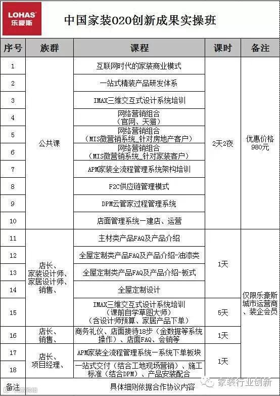 课程全部为实战课程,涉及:中国家装O2O创新成果的建店系统&店面管理培训、网上平台联合营销系统培训、四大软件系统培训、产品与服务等供应链管理培训,涉及家装销售族群、设计族群、工程族群、供应商族群,涵盖家装公司各工种各岗位,培训完成后成绩合格者颁发中国家装O2O创新成果实操培训相关资质证书。一场完美的家装镀金培训盛宴即将开幕,各位家装精英们还在等什么?