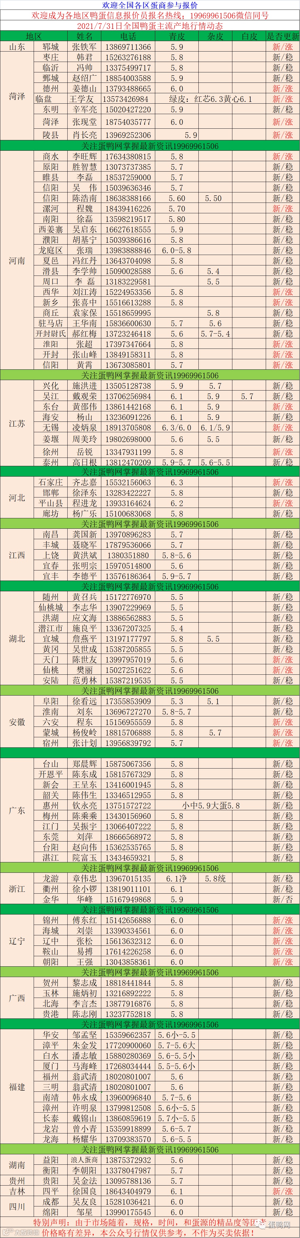 2021年7月31日鲜鸭蛋价格:初产至大蛋6.0(鸭蛋价格仅供参考)