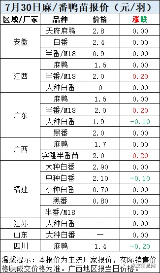 明日麻鸭苗报价稳定。半番鸭苗报价上涨0.2元/羽。