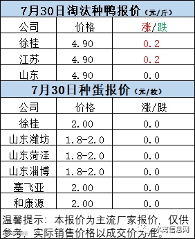 一、7月29日晚至7月30日 白羽肉鸭报价