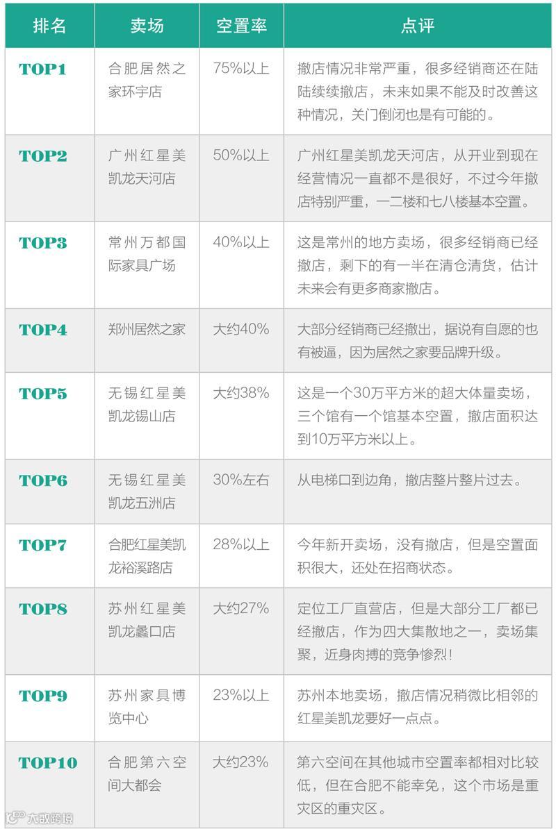 从整个调查情况看,我们走访的16个城市52个卖场中,基本上每一个卖场都存在有撤店空置的现象,只不过有的情况比较严重有的情况相对好一点罢了。根据走访情况进行空置率排名,前十名主要是分布在各地的红星美凯龙与居然之家。以下是具体的排名榜: