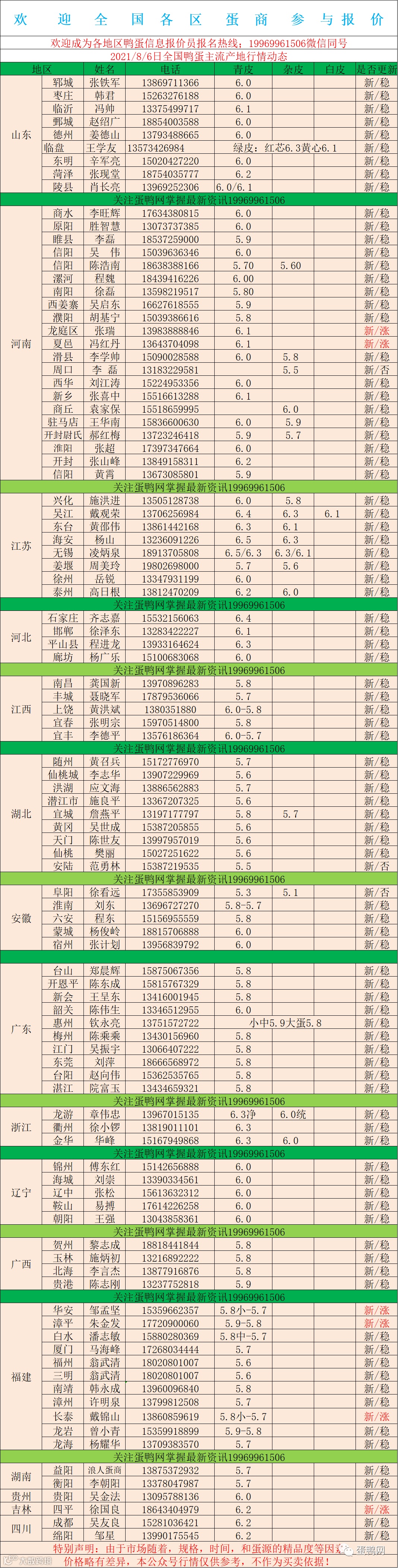 2021年8月6日鲜鸭蛋价格:初产至大蛋6.0(鸭蛋价格仅供参考)