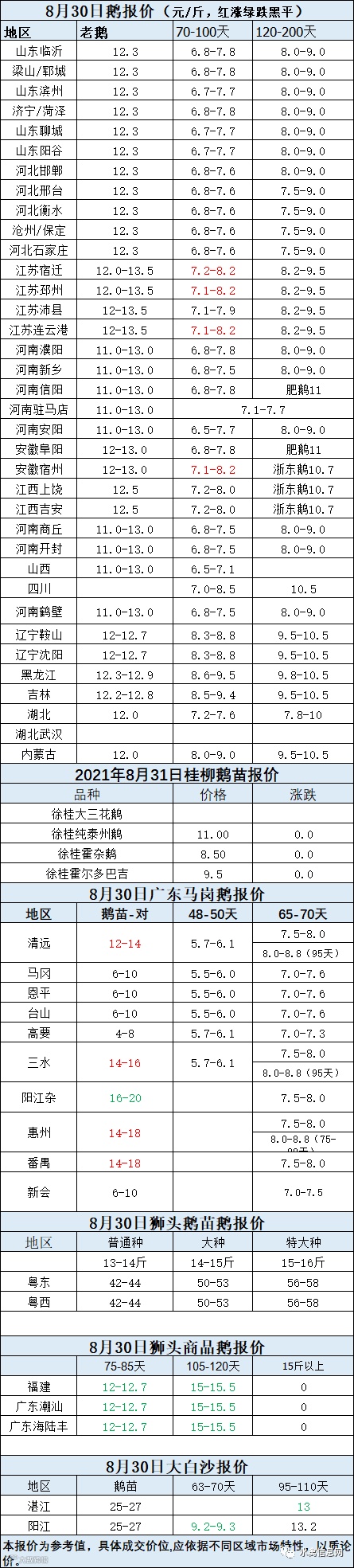 2021年8月30日鹅种蛋价格(元/枚)停报