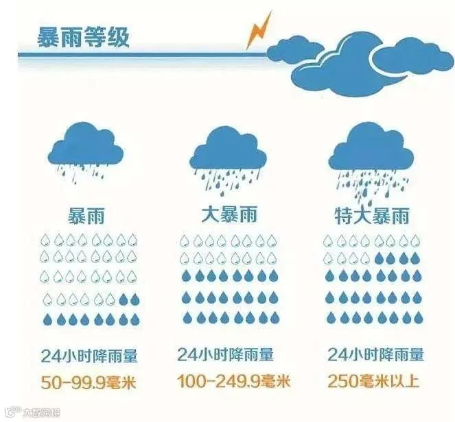 当暴雨升级,24小时降水量达到100-250毫米叫做大暴雨,相当于无数个矿泉水瓶在向你浇水,分分钟湿身。