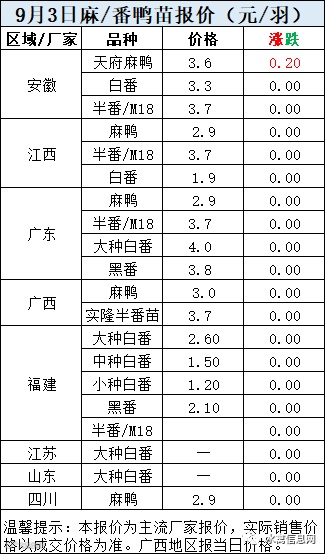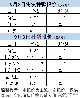 一、9月2日晚至9月3日 白羽肉鸭报价